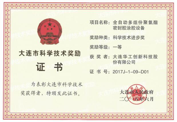 证书介绍 大连市人民政府在2018年6月8日下达的《大连市人民政府关于2017年度大连市科学技术奖励的决定》中授予本公司《全自动多组份聚氨酯密封胶涂胶设备》为大连市2017年度科学技术进步奖一等奖。 HGIT品牌的全自动多组份聚氨酯密封胶涂胶设备(又叫涂胶机、点胶机)是针对聚氨酯材料和硅胶材料研发的涂胶设备,主要应用于机柜、汽车(汽车门内板、汽车喇叭、汽车门锁、汽车天窗、扰流板和灯具)等密封行业。项目获得授权的核心发明专利10项和实用新型专利6项。涂胶设备性能与国外产品处于同一水平,填补了国内空白,具有显著的竞争优势,提高了我国涂胶密封产品的质量。 证书图片 |