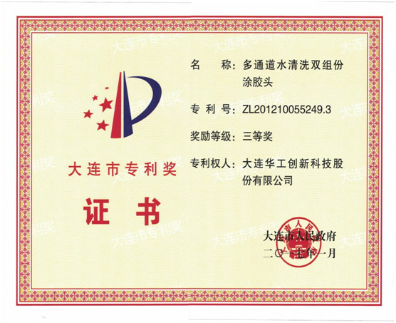 荣誉资质 证书介绍 大连市人民政府在2017年1月31日下达的《2016年度大连市专利奖奖励决定》中授予本公司《多通道水清洗双组份涂胶头》专利(专利号:ZL201210055249.3)为大连市专利奖三等奖。 大连华工创新科技股份有限公司一定会珍惜荣誉、再接再厉,继续发扬求真务实精神,积极探索,大胆创新,不断取得新成绩! 华工创新将坚持不懈地以创新的技术、卓越的解决方案和优质的服务为客户提供全面支持。客户满意是决定我们成功的最关键因素,只有客户成功才能成就我们的未来。 我们为客户提供迅速、完善、优质、的解决方案与服务。 尽职敬业是我们立足的基础。 创新,是我们发展的不竭动力。 节能环保,是我们的责任,更是我们的一项事业。 华工创新HGIT品牌的密封系统、发泡机、隔热注胶系统以及门窗系统为客户提供创新有益的解决方案,从而提高他们的产品质量。同时,公司还针对客户的需求量身定制节能、环保、增效和节约成本的系统自动线,用专业技术服务全球客户。 证书图片 |