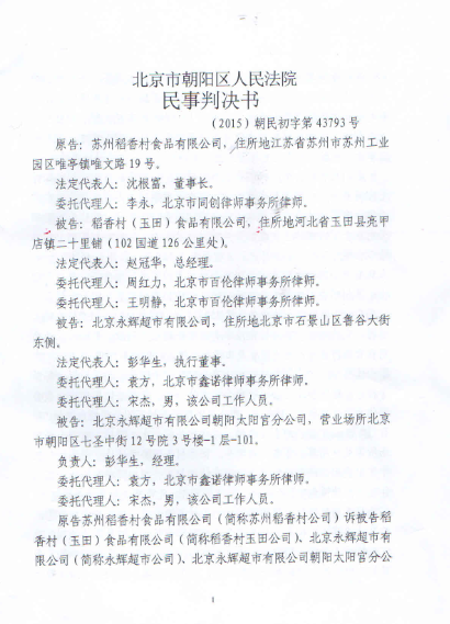 2015年,苏稻起诉玉田稻香村侵权,北京市朝阳区人民法院认为苏稻拥有“稻香村”商标专用权,认定玉田稻香村侵权,判决玉田稻香村停止侵权行为,并登报启事消除影响,同时赔偿苏稻74万余元经济损失。
