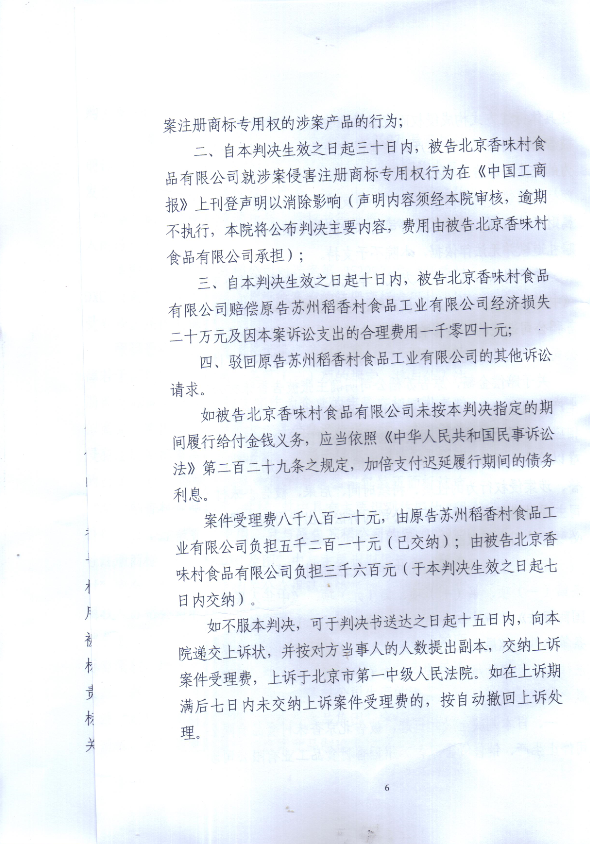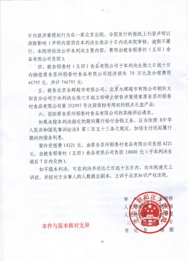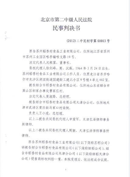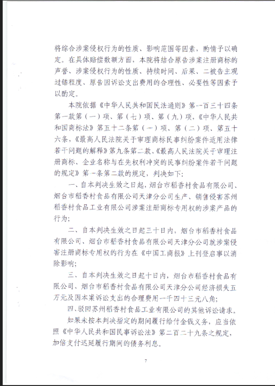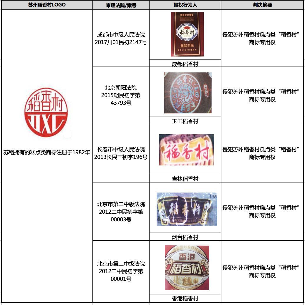 其中2011年,苏稻起诉烟台稻香村侵权,北京市第二中级人民法院认为苏稻拥有“稻香村”商标专用权,认定烟台稻香村侵权,判决烟台稻香村停止侵权行为,并登报启事消除影响,同时赔偿苏稻5万元经济损失。