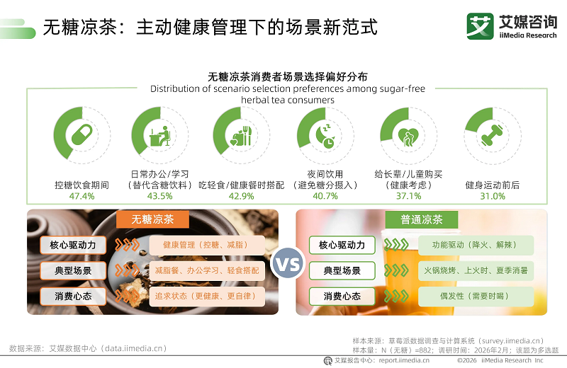 当前,消费者选择无糖凉茶的场景呈现出清晰的“主动健康管理”特征,与普通凉茶主要服务于“降火”等即时功能需求不同,无糖凉茶正在融入消费者更日常、更自律的生活方式之中。