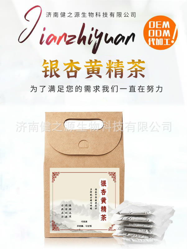 品牌:济南健之源银杏黄精茶 银杏叶茶中老年养生茶 OEM贴牌代加工 代用茶oem贴牌代加工 济南健之源 产品名称:银杏黄精代用茶 原料与配料:银杏(白果)、黄精、松花粉、火麻仁、决明子、桑葚、茯苓、枸杞子