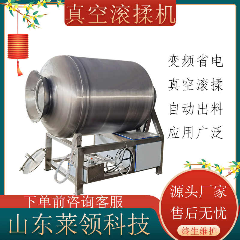 真空滚揉机是在真空状态下,利用物理冲击的原理,让肉在滚筒内上下翻动,相互撞击、摔打,达到滚揉、腌渍效果,使肉均匀的吸收腌渍,提高肉的结着力及产品的弹性,通过滚揉使肉体蛋白质分解成水溶性蛋白,易被人体吸收,同时能使添加料(淀粉等)与肉体蛋白质互为融合以达到肉质变嫩,口感好,出品率高。本机具有肺呼吸功能,让产品在滚筒内膨胀、缩小了往复运动,提高了切面效果。