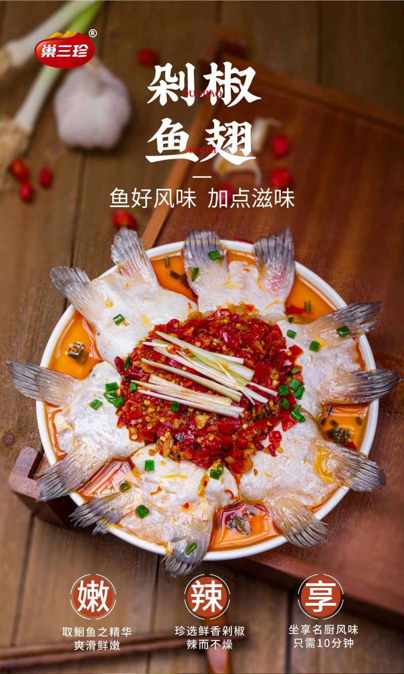 鱼副产品剁椒鱼翅选用新鲜鮰鱼,18个月自然生长,肉质爽滑鲜嫩。剁椒鱼翅含冻鱼翅250g、剁椒包60g,标准净重,餐饮、烤鱼专用。另公司生产鱼泡、鱼排、鱼唇、鱼肚片、鱼胃等鱼副产品,特别适合食堂和酒店餐饮的特色菜。
