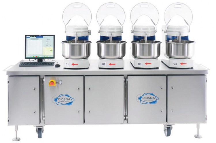 该系统最多可管理6个DIOSNA SP-12型螺旋和面机,通过一个可编程逻辑控制器PLC进行集成控制。