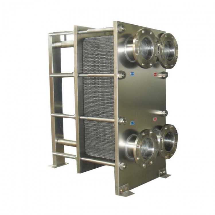 板式换热器是近几十年来得到发展和广泛应用的一种新型高效、紧凑的热交换器,它由一系列互相平行、具有波纹表面的薄金属板相叠然后用夹板、螺栓紧固装配的一种换热器。冷热两种工作流体相间在每两块相邻板片组成的狭小而曲折的通道中流过,并通过间隔冷热流体的板片进行冷热交换。