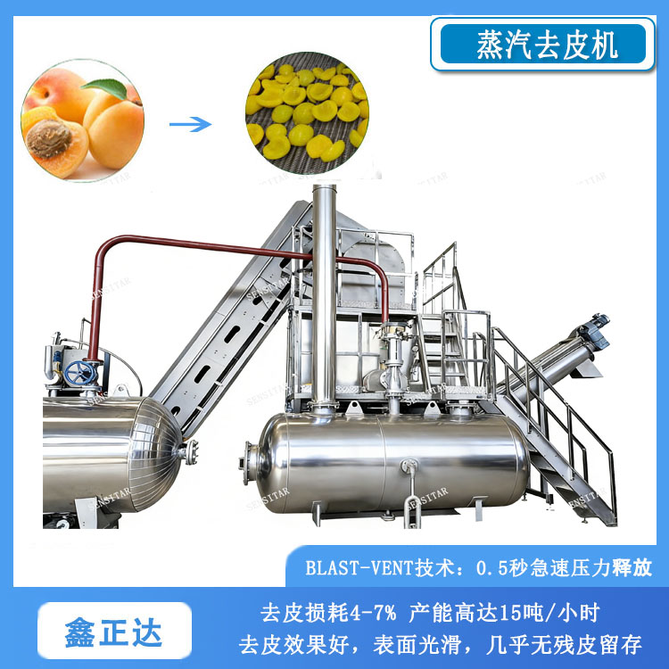 蒸汽去皮机由提升机、称重料仓、反应罐、排气罐、架体、蒸汽系统、电控系统等组成,是块茎、水果等去皮快速、高效的设备。与传统去皮方法损耗超过20%相比,蒸汽去皮机可以将去皮损耗降低到4-7%,显著提高产品出成率