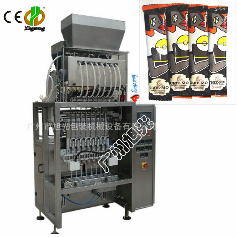 功能: 该系列多排背封液体包装机采用PLC加光电控制系统,可自动完全计量、制袋、填充、封合、切断、打印日期等工序。可用于包装各种液体、膏体类物品。如:番茄酱、沙拉酱、果汁、调味料、果冻条等。