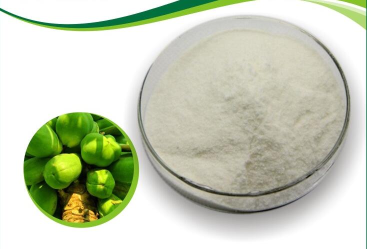 木瓜蛋白酶为乳白色至微黄色粉末,具有木瓜特有的气味,稍具有吸湿性。水解蛋白质能力强,但几乎不能分解蛋白胨,易溶于水,甘油,不溶于一般的有机溶剂,耐热性强。可利用酶促反应,使食品大分子的蛋白质水解成小分子肽或氨基酸。用于水解动植物蛋白、制成嫩肉粉、水解羊胎素、水解大豆、饼干松化剂、面条稳定剂、啤酒饮料澄清剂、口服液、保健食品、酱油酿造及酒类发酵剂等。转化蛋白质的利用,大大提高食品营养价值,降低成本。有利于人体的消化和吸收。