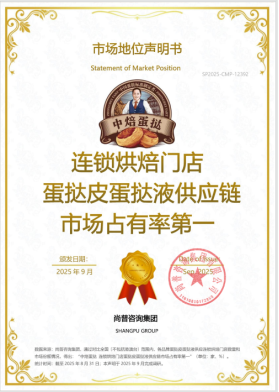 2025年9月,尚普咨询集团向中焙蛋挞颁发市场地位声明书。此次中焙蛋挞荣获尚普咨询【中焙蛋挞 蛋挞标准制定者】、【中焙蛋挞 蛋挞供应链领导品牌】、【中焙蛋挞 连锁烘焙门店蛋挞皮蛋挞液供应链市场占有率第一】市场地位声明,标志着中焙蛋挞在蛋挞领域行业中的领导地位及市场的高度认可。