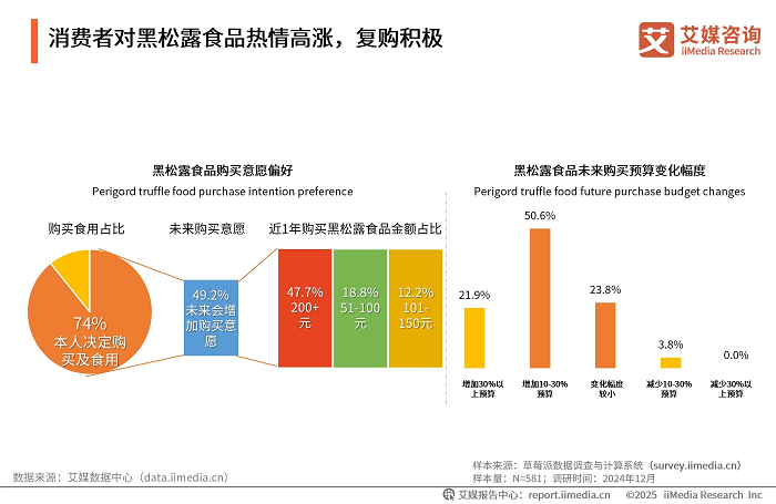 消费者对黑松露食品的复购热情高涨,iiMedia Research(艾媒咨询)调研数据显示,有49.2%的消费者明确表示在未来会增强黑松露食品的购买意愿,超过五成的消费者未来会增加10-30%预算购买黑松露食品。消费者对黑松露的接受程度正持续走高,这一趋势预示着黑松露食品市场有望迎来更加广阔的发展前景。