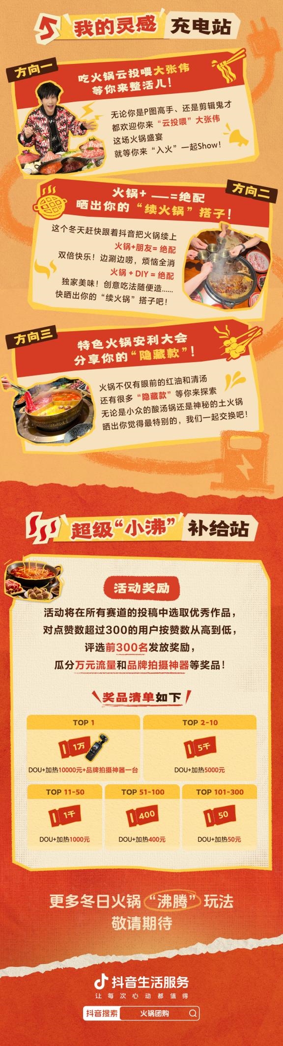 光是分享最爱的火锅店还不够?吃火锅的每一个快乐瞬间都值得被记录!「抖音生活火锅季」懂大家吃火锅时的意犹未尽,于是特别发起全民“沸腾合火人”续火锅大赛,为大家的畅吃续“沸”。快上抖音分享出你的“真香”火锅名场面吧,无论是“馋哭隔壁桌”的C位锅底,还是独家秘制的隐藏吃法,又或是和好友抢肉时爆笑的翻车现场……11月7日至12月21日,上抖音晒出你的“冬日火锅沸腾时刻”,带话题词 #抖音生活火锅季、#火锅团购 并@抖音生活服务 官方账号,即有机会瓜分上万DOU+流量奖励,赢品牌拍摄神器!快来参与投稿,边和云搭子们吃火锅,边收获额外“小沸”惊喜!