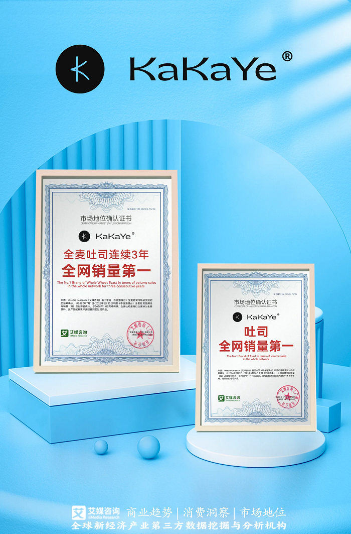 近期,卡卡业获全球领先的新经济产业第三方数据挖掘和分析机构iiMedia Research(艾媒咨询)授予的“全麦吐司连续三年全网销量第一”“吐司全网销量第一”双项市场地位确认。