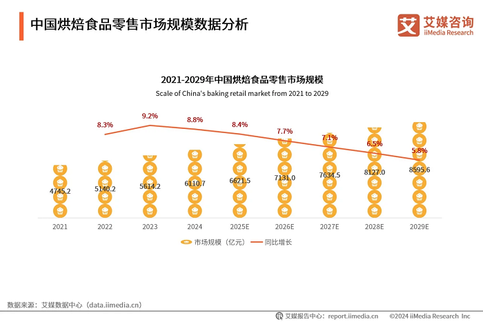 在健康消费升级与烘焙行业结构性变革的双重驱动下,全麦面包赛道近年来呈现出爆发式增长态势。iiMedia Research(艾媒咨询)发布的《2024-2025年中国烘焙食品行业现状及趋势研究报告》数据显示,预计2025年中国烘焙食品零售市场规模达6621.5亿元,同比增长8.4%。伴随人均消费能力的提升与餐饮消费结构的优化,中国烘焙食品零售市场正迎来持续扩容的发展态势,预计到2029年可达8595.6亿元。