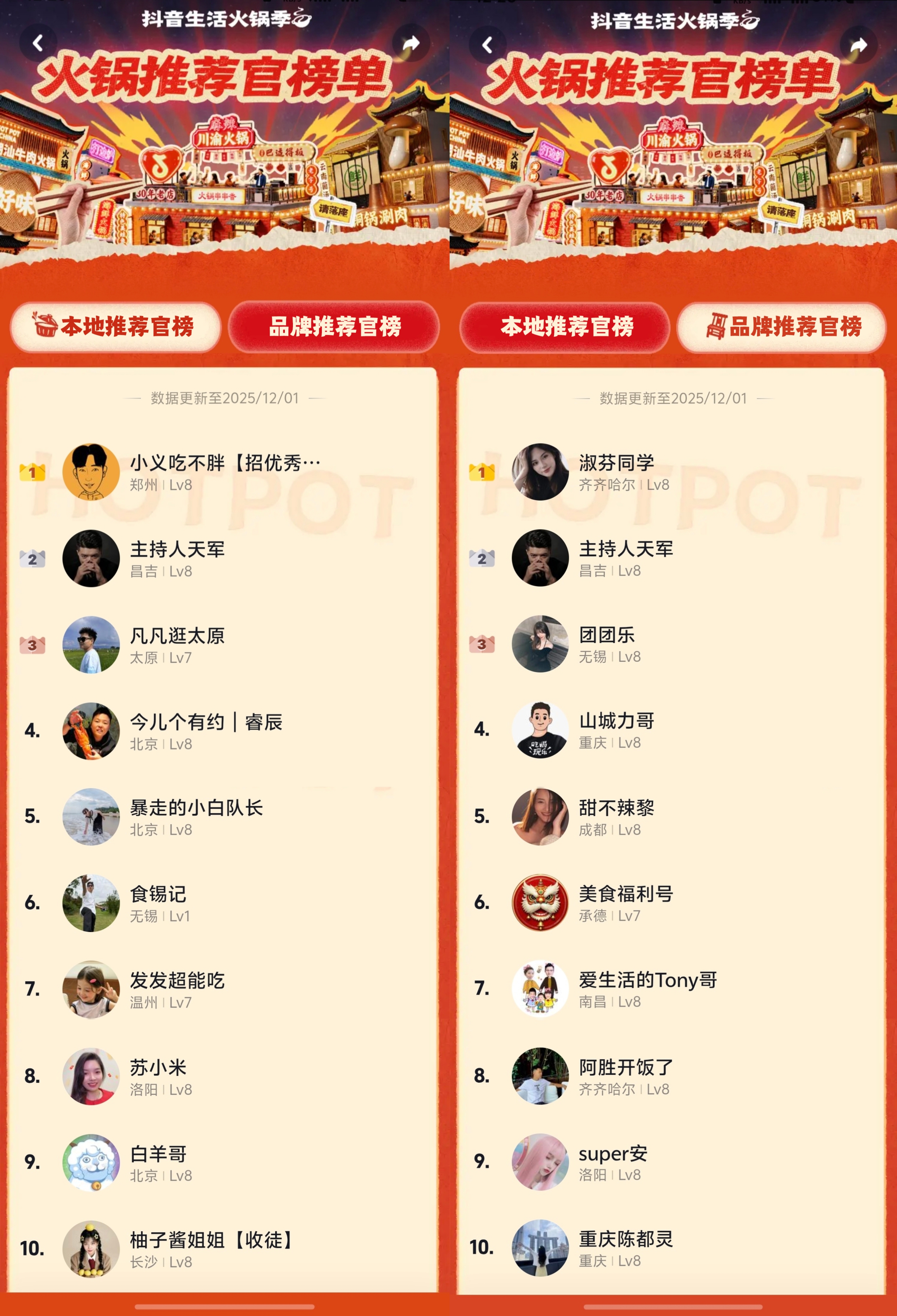 最终,平台将综合带货成绩与视频点击量两大核心指标,评选出火锅推荐官榜单「本地推荐官榜」与「品牌推荐官榜」两大赛道各自的 TOP10 达人。上榜达人最高可获8000元奖金激励、全网线上千万资源扶持,还有机会以「火锅推荐官」身份参与到红毯秀,脱口秀等大型线下活动,获得与火锅商家面对面的交流机会,对接更多优质商单,扩大商业影响力。截至12月1日0点,「本地推荐官榜」与「品牌推荐官榜」上榜进度如下: