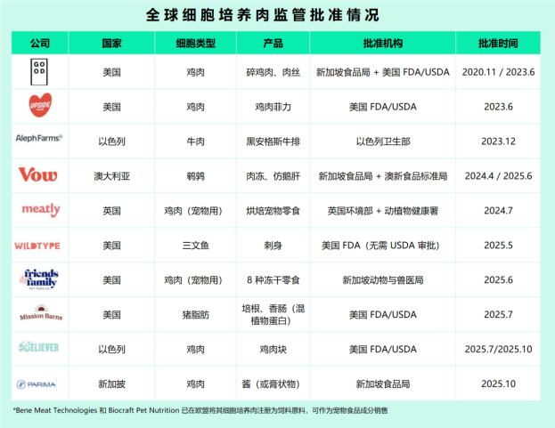 全球细胞培养肉产业正迎来从技术突破迈向商业化应用的集中爆发期,自2020年新加坡在全球率先批准细胞培养鸡肉产品上市以来,行业监管准入的步伐明显加快。截至目前,全球已有5个国家(新加坡、美国、以色列、澳大利亚、英国)的10家企业的细胞培养肉产品获得了相应市场的批准,仅2025年内,就有6例细胞培养肉新产品获得监管放行,市场拓展显著加速。这一进展清晰地表明,细胞培养肉已不再是未来的概念,而是正在多个关键市场落地生根的现实产品,为整个产业进入规模化商业爆发奠定了坚实的监管与市场基础。