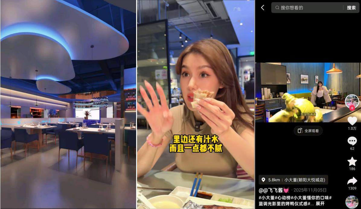 入驻抖音后,小大董以「内容种草」为核心,联合平台发起#蓝调光影里的烤鸭仪式感、#酥不腻鸭皮蘸白糖YYDS 等话题,借助达人短视频着重展现蓝调门店环境与菜品仪式感,制造强种草点;直播端坚持「提频不破价」策略,统一开播画面与宣传口径;同时参与平台自制微综《组局冲冲冲》,拓展内容呈现形式。上榜抖音生活服务心动榜餐厅后,品牌的线上核销率大幅提升,15天订单占比达48%,曝光与转化同步攀升。