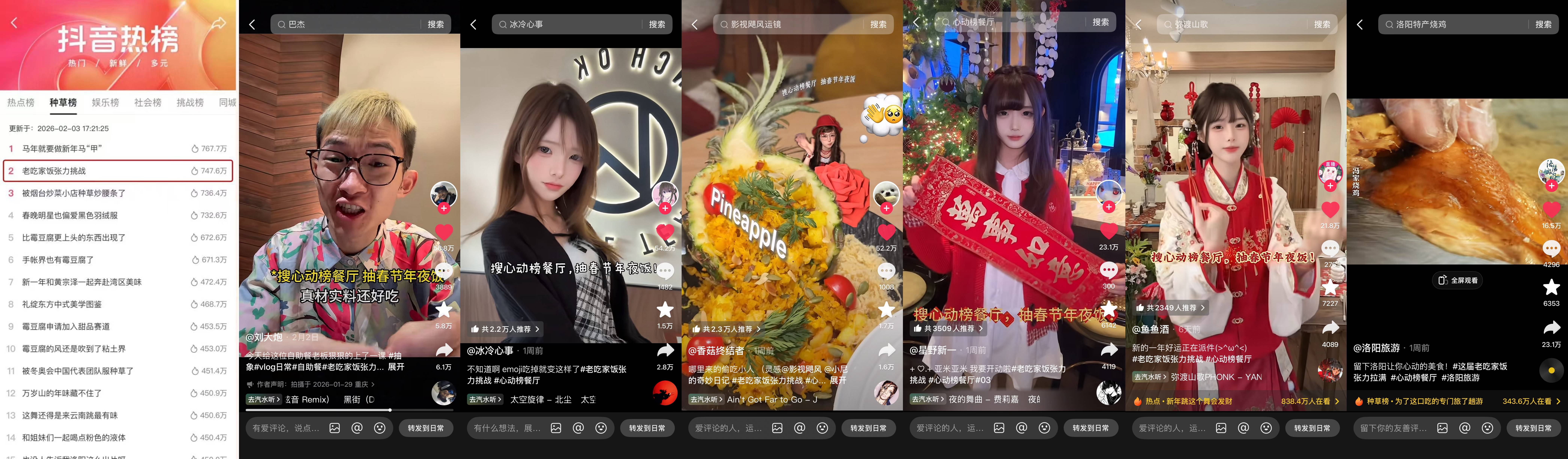 如今,年轻人对一个“吃货”最大的赞美,是“此人吃商应该在我之上”的极致肯定。作为“老吃家”的一员,年夜饭不正是“修炼吃商”的最佳时机?抖音生活服务心动榜餐厅在年底新春团圆聚餐之际,在抖音发起 #老吃家饭张力挑战 话题4天反复上榜4次,最高登榜抖音种草榜TOP2,引发全国文旅账号与各垂类达人踊跃参与,掀起了一波年味美食回顾热潮。