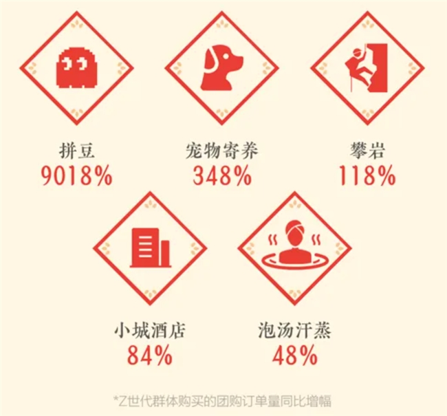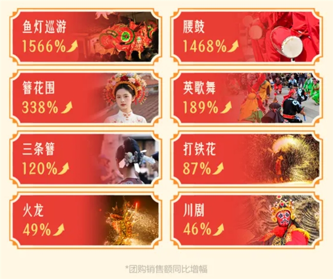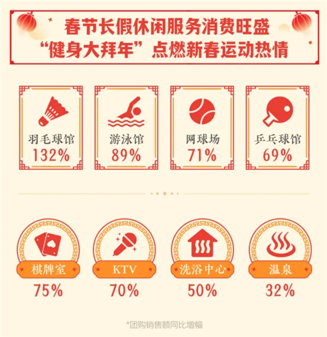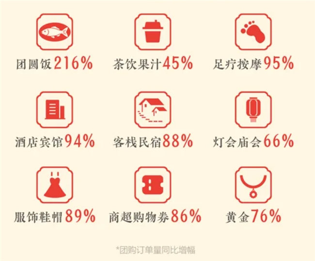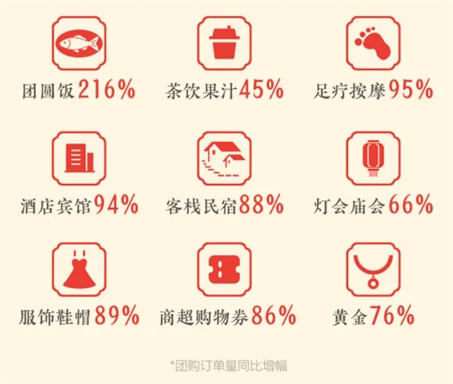 酒店宾馆团购量涨了94%,客栈民宿涨了88%,灯会庙会涨了66%,足疗按摩涨了95%,茶饮果汁涨了45%...