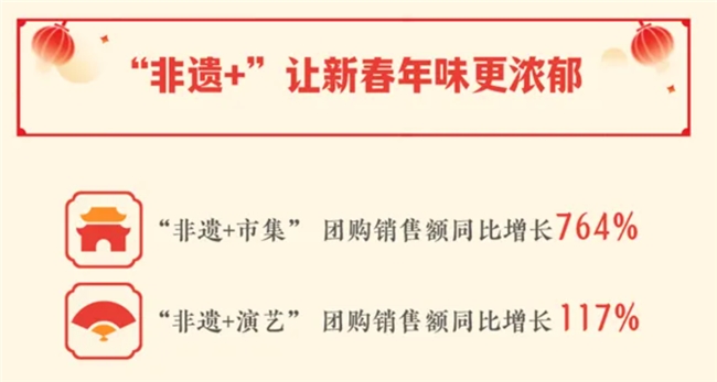 看看数据,"非遗+市集"团购销售额同比暴涨764%,"非遗+演艺"涨了117%。
