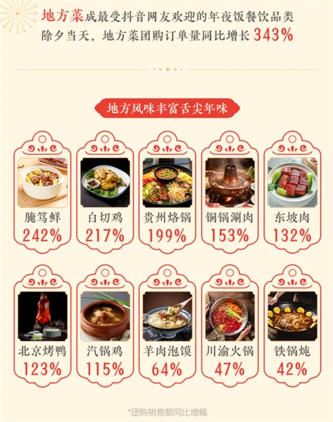 根据抖音春节消费数据报告,除夕当年,年轻人给年夜饭团购套餐订单干翻两圈,同比暴涨245%。