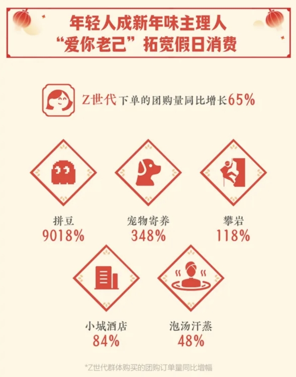 再看住宿,酒店宾馆、客栈民宿团购量同比增长94%和88%。这背后其实是两股人流在交汇:一股是“返乡游”,年轻人回老家了,但想住得舒服点,不愿挤在老房子里;另一股是“异地游”,全家干脆换个城市过年,去体验不一样的风土人情。