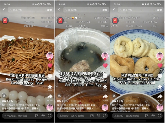 @Q子的Q,在抖音上晒了一桌令人咂舌的江西版的“硬核”年夜饭:勃艮第秘制风味意面能量碗,北纬28度臻品谷饲肉糜慢炖溏心宝石,阿尔卑斯冰川零卡糖软欧,普罗旺斯田园时蔬低温黑松露浓汤,巴塞罗那有机莲藕麻辣冷拼,密西西比原麦手作分子料理……是不是一脸懵?实际上勃艮第秘制风味意面能量碗就是拌粉,北纬28度臻品谷饲肉糜慢炖溏心宝石就是肉饼皮蛋汤……这种极致反差引爆了评论区:“笑着笑着就哭了,这才是家的味道!”、“原来我家门口就有米其林!”。