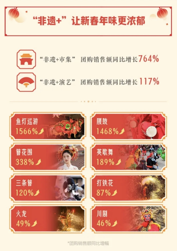 如果说以前旅游是“上车睡觉,下车拍照”,那现在的旅游就是“穿上汉服,我就是古人”。报告里提到,“非遗+市集”的团购销售额狂飙,鱼灯巡游、腰鼓这些项目的销售额都超过了10倍。