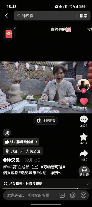 钟汉良新年“耍”在成都,体验成都三件套:喝茶,看剧,搓麻;@甜辣小料 在抖音上晒出了用拼豆做的春联,“一代人有一代人的十字绣,拼豆就是我们年轻人的十字绣”;@林亦LYi给智能眼镜做了个打麻将的外挂,决战春节……