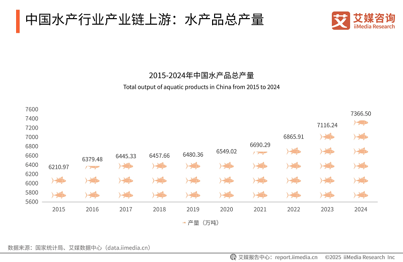 iiMedia Research(艾媒咨询)发布的《2025-2026年中国水产行业现状及消费趋势洞察报告》显示,2015-2024年中国水产品总产量逐年递增,2024年达7366.50万吨,居民对水产品的需求持续带动供应端增长。水产品富含蛋白质及多种微量元素,契合大众健康饮食需求,为海参等滋补品类发展奠定了基础。