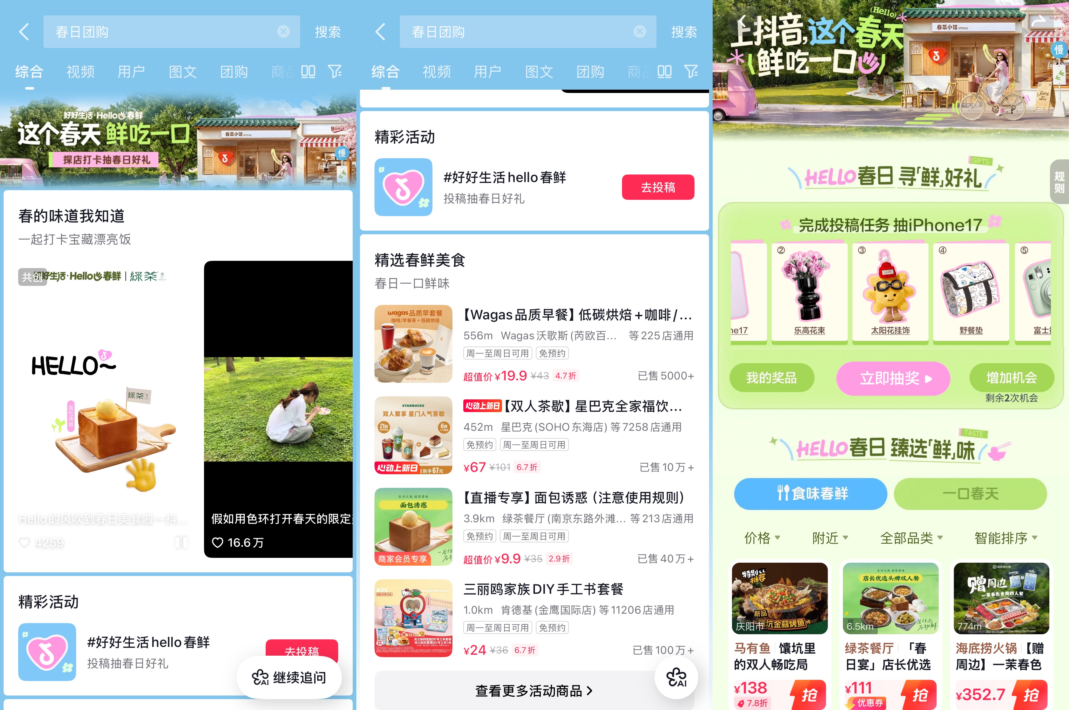 活动同步推出平台专属团购优惠,以高性价比降低决策门槛, 一站式满足用户春日消费需求,实现对春日饮食场景的深度覆盖与高效转化。