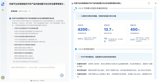 基于品牌在巨量云图的全量数据资产与官方商业化知识库,融合大语言模型检索、分析、生成能力,为品牌自动输出可直接落地的AI营销策略。