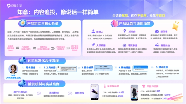 「知意(AI有刷)」以“AI理解人”为核心,突破过去标签的静态局限:一方面深度解析用户全链路行为与潜在消费意图,精准匹配用户的兴趣场景与使用场景,输出定制化追投策略;另一方面可实时判定用户潜在购买意愿,对高意向用户开展精准广告追投,持续拉升目标人群渗透率,投后场景渗透率最高可达70%。